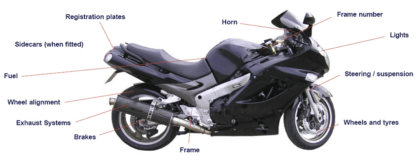Lights - condition, operation, security and correct colour of headlamp(s), rear lights, indicators and reflectors. Also the headlamp(s) will be checked to see if the aim is correct. Steering/suspension - condition, security and operation, including forks, mountings, controls, bearings etc. Wheels and tyres - wheel condition and security, tyre condition, size/type and tread depth. Frame - free from cracks, damage, distortion or corrosion which is likely to affect the steering or brakes. Brakes - condition, operation and performance (efficiency test), brake controls. Fuel & exhaust systems leaks - complete, secure, and not too noisy.